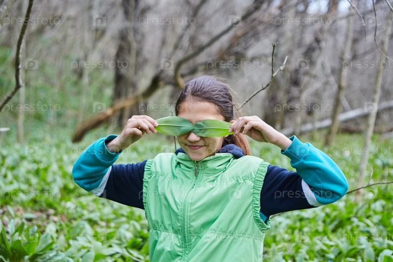 Девушка весной собирает на лугу лекарственный съедобный лесной чеснок. Дикая кухня