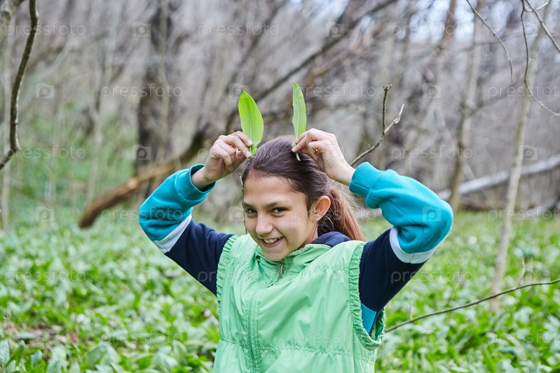 Девушка весной собирает на лугу лекарственный съедобный лесной чеснок. Дикая кухня