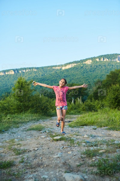 Летом по проселочной дороге бежит девушка с букетом полевых цветов в руках. Счастье и улыбка. На заднем плане горы