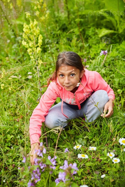 На газоне девочка школьного возраста собирает землянику. Дикие ягоды в пищу