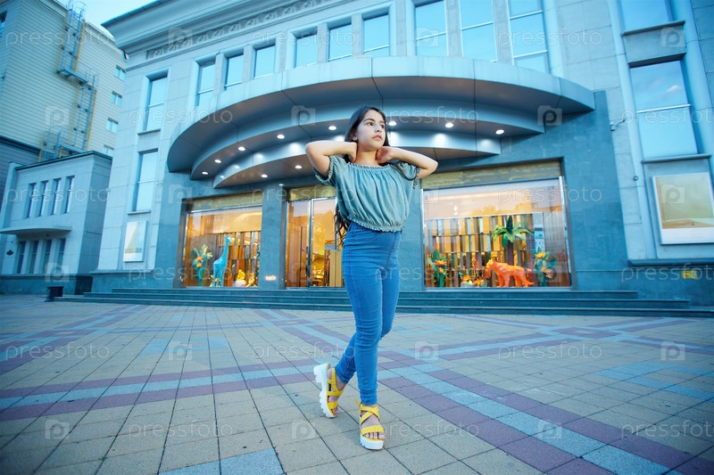 Девушка в современной европейской одежде на улице города в сумерках. Огни витрин на заднем плане