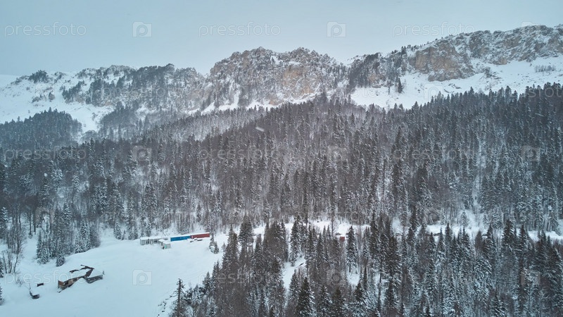 Высокие горы в снегу во время метели. С высоты птичьего полета