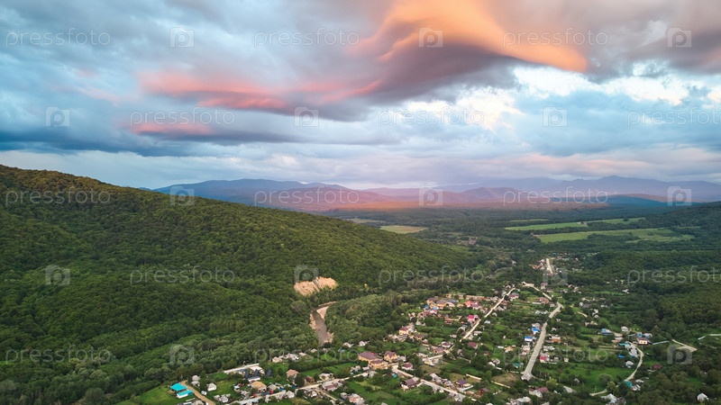 Небольшая деревня у подножия гор и на берегу реки. Время суток — закат. Время года лето
