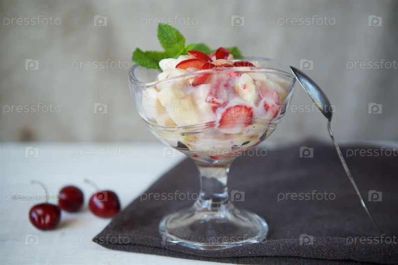Салат из свежих фруктов с греческим йогуртом в стеклянном стакане. Вегетарианский десерт