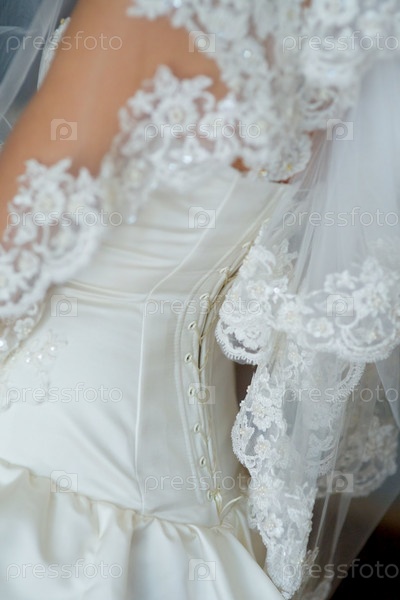 Корсет свадебного платья невесты крупный план, ткань с кружевом и застежкой