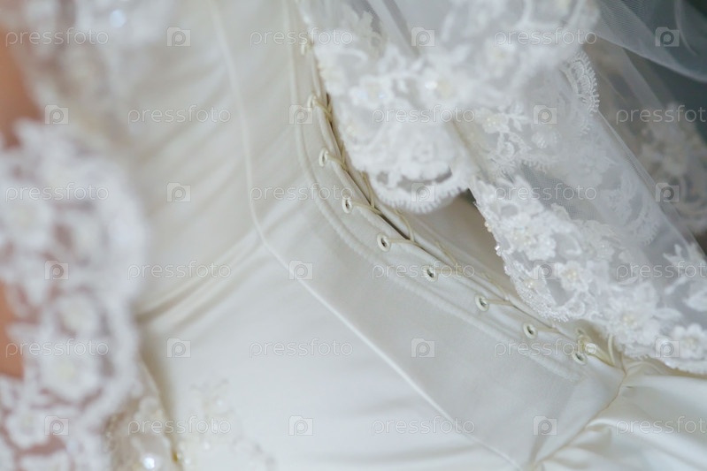 Корсет свадебного платья невесты крупный план, ткань с кружевом и застежкой