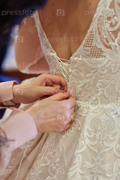 Подружка невесты помогает невесте застегнуть корсет крупным планом и надеть платье