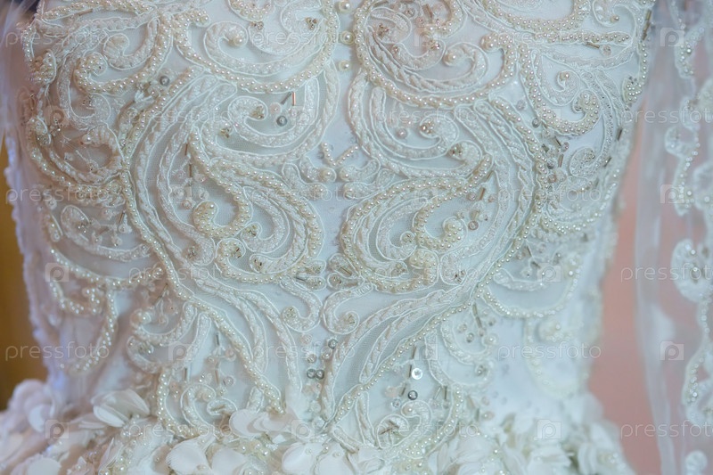 Корсет свадебного платья невесты крупный план, ткань с кружевом и застежкой
