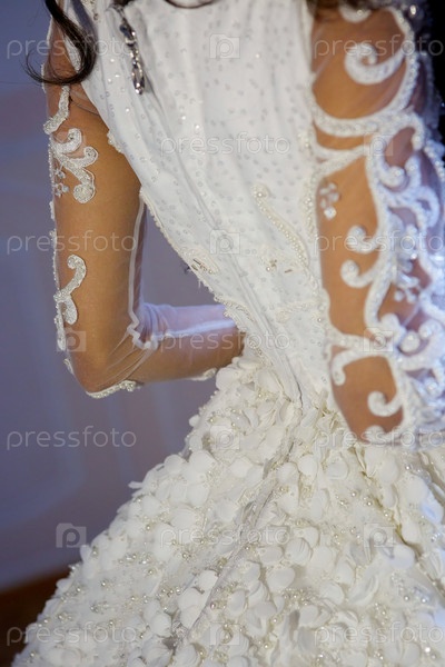 Корсет свадебного платья невесты крупный план, ткань с кружевом и застежкой