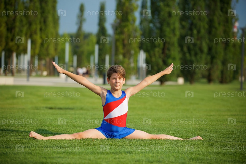 Мальчик-гимнаст школьного возраста в костюме демонстрирует элементы спорта. Мальчик-гимнаст школьного возраста в костюме демонстрирует элементы спорта