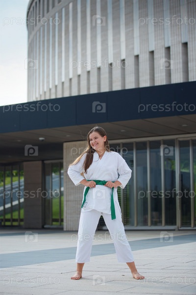 Девушка школьного возраста, занимающаяся боевыми искусствами, в кимоно демонстрирует элементы спорта