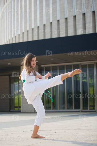 Девушка школьного возраста, занимающаяся боевыми искусствами, в кимоно демонстрирует элементы спорта