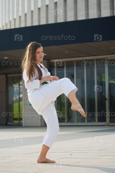 Девушка школьного возраста, занимающаяся боевыми искусствами, в кимоно демонстрирует элементы спорта
