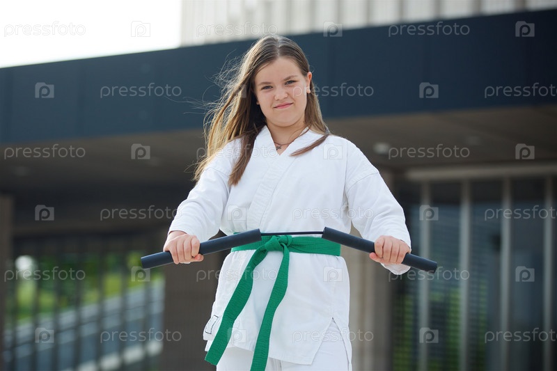 Девушка школьного возраста, занимающаяся боевыми искусствами, в кимоно демонстрирует элементы спорта