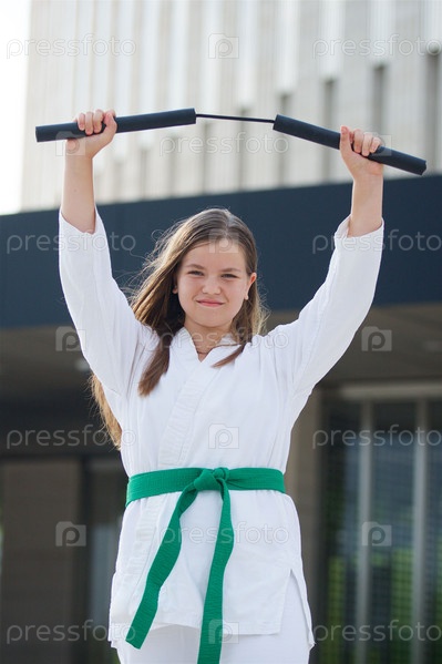 Девушка школьного возраста, занимающаяся боевыми искусствами, в кимоно демонстрирует элементы спорта