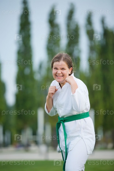 Девушка школьного возраста, занимающаяся боевыми искусствами, в кимоно демонстрирует элементы спорта