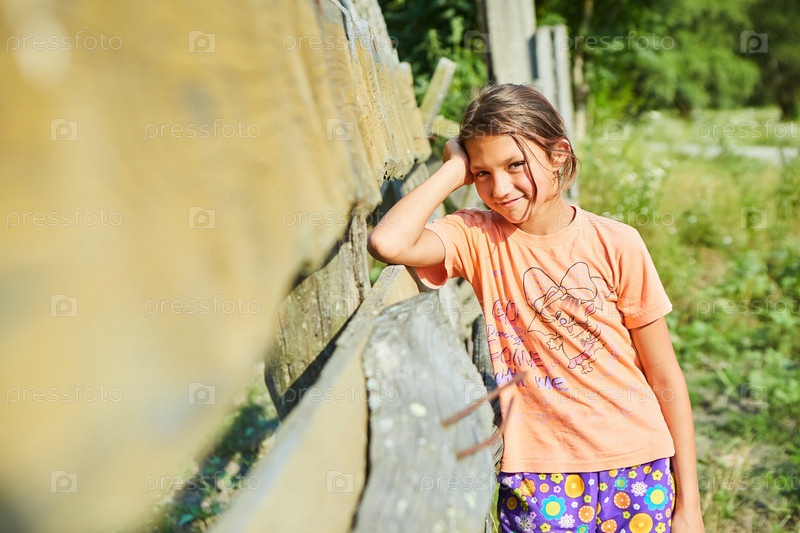 Девочка школьного возраста стоит возле деревянного деревенского забора в окружении диких трав и цветов