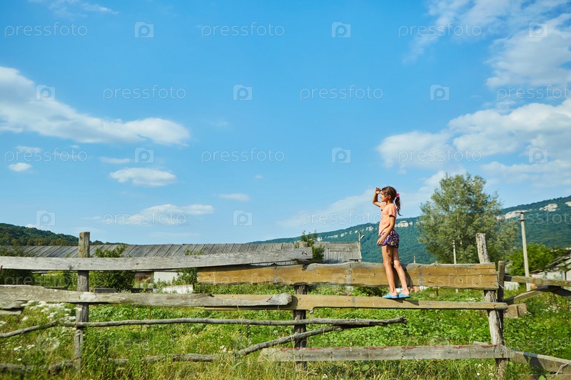 Девочка школьного возраста стоит на деревянном деревенском заборе в окружении диких трав и цветов