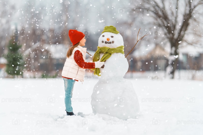 Девочка играет со снеговиком