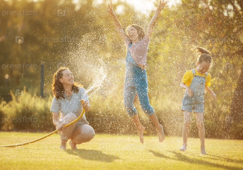 Счастливая семья играет на заднем дворе