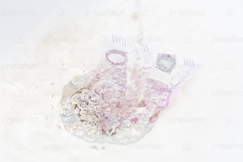 Концепция пустой траты денег, переплат и сбережений, купюра в 500 евро утекает с водой в раковине, потоком воды и деньгами