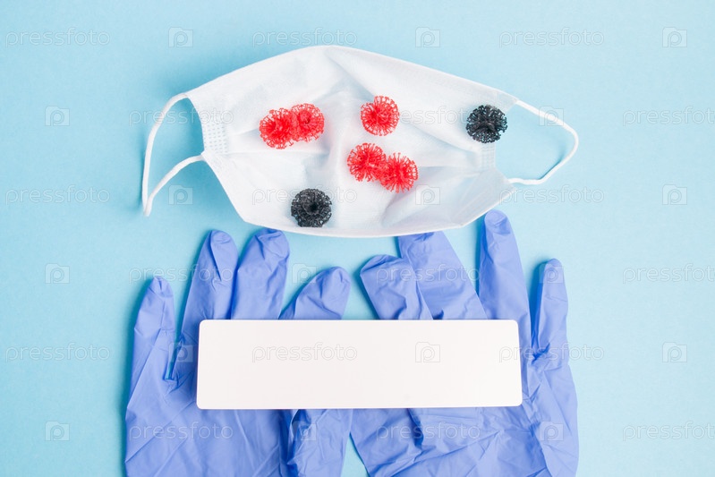 Медицинская маска для лица, резиновые одноразовые перчатки на синем фоне, маленькие модели вирусов в маске, защита от коронавирусной инфекции, пространство для копирования