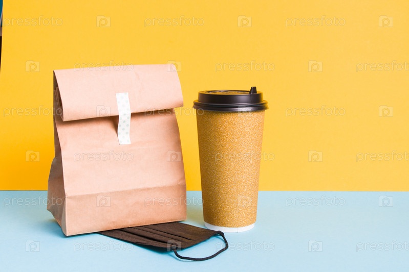 Концепция бесконтактной доставки еды, черная защитная маска, картонная чашка кофе в золотой блестящей упаковке и бумажном пакете, голубой и желтый фон, пространство для копирования