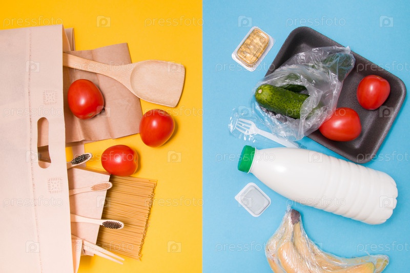 Образ жизни без отходов против загрязнения окружающей среды с одноразовым пластиком, различной пластиковой упаковкой и экологически чистой упаковкой на желтом и синем фоне копией пространства вид сверху