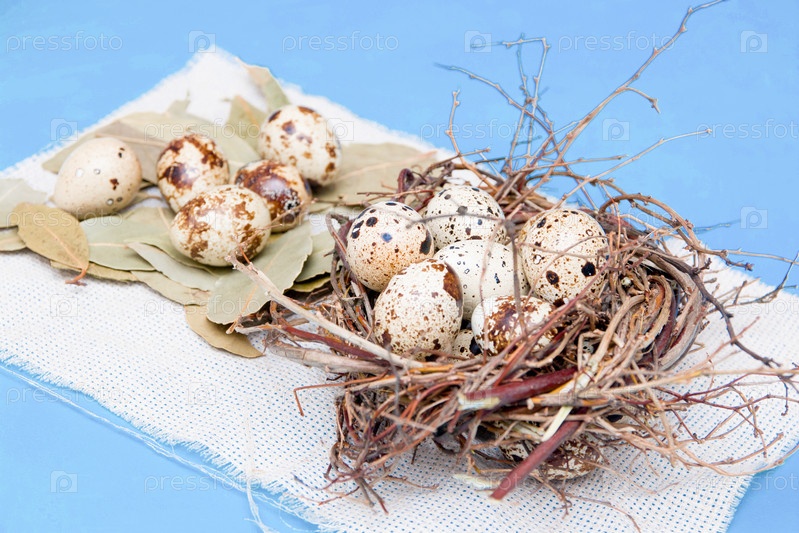 Перепелиные яйца в гнезде из ветвей на синем фоне, светлая ткань, несколько яиц на подстилке из лавровых листьев, пасхальный фон, пространство для копирования
