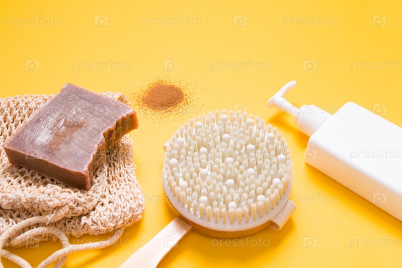 Белый фоакон с дозатором без этикетки, щетка для сухого массажа, кусочек домашнего шоколадного мыла и вязаная мочалка и горсть молотого кофе на желтом фоне