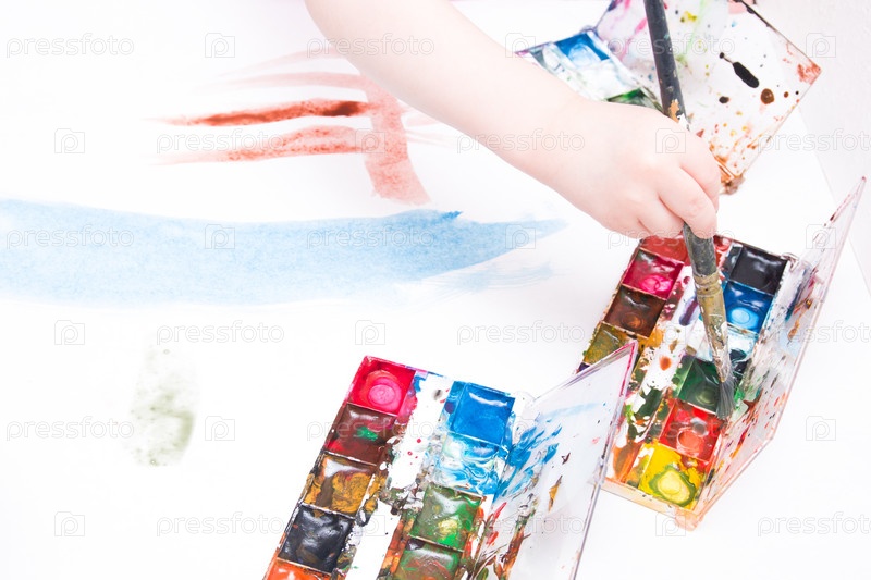 Ребенок рисует кистью акварелью на белом листе, столе, копировальном пространстве, несколько упаковок акварели, в руке большая художественная кисть, банка с водой