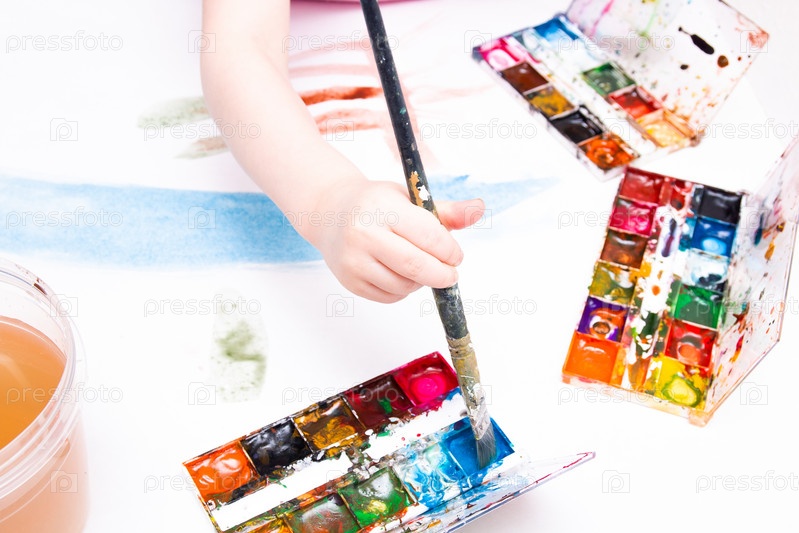 Ребенок рисует кистью акварелью на белом листе, столе, копировальном месте