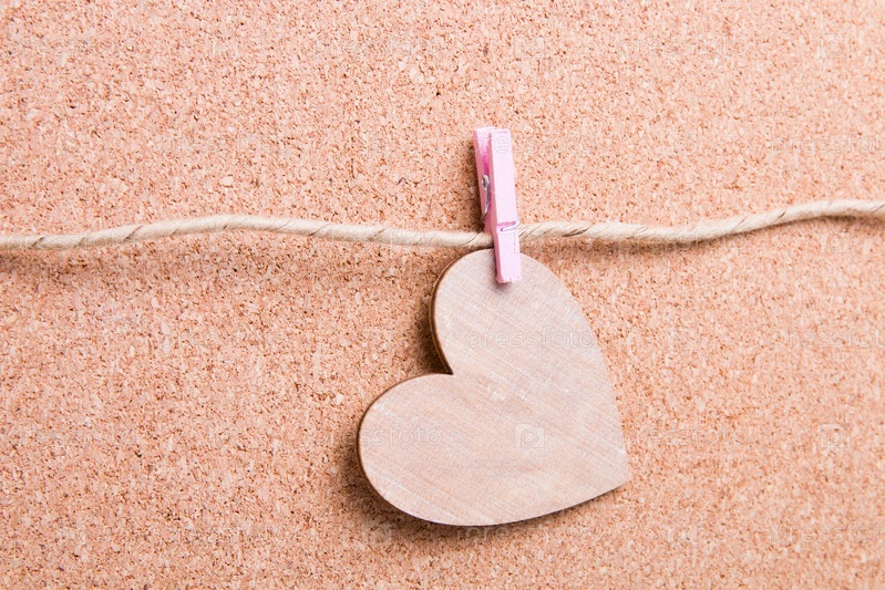 Деревянное сердце висит на розовой деревянной маленькой прищепке на бумажной веревке на фоне пробковой доски