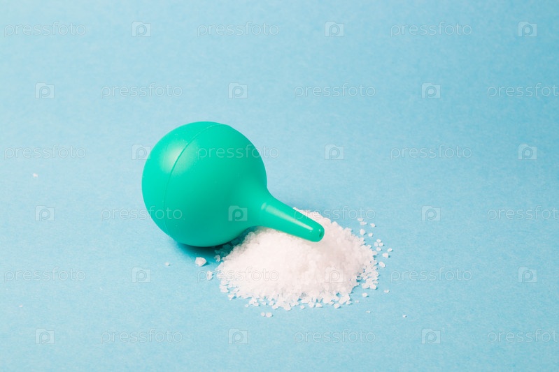 Маленькая зеленая резиновая клизма с горстью морской соли на голубом фоне, пространство для копирования, промывание носа соленой водой для лечения насморка, лечение концепции простуды