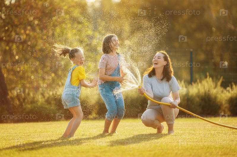 Счастливая семья играет на заднем дворе