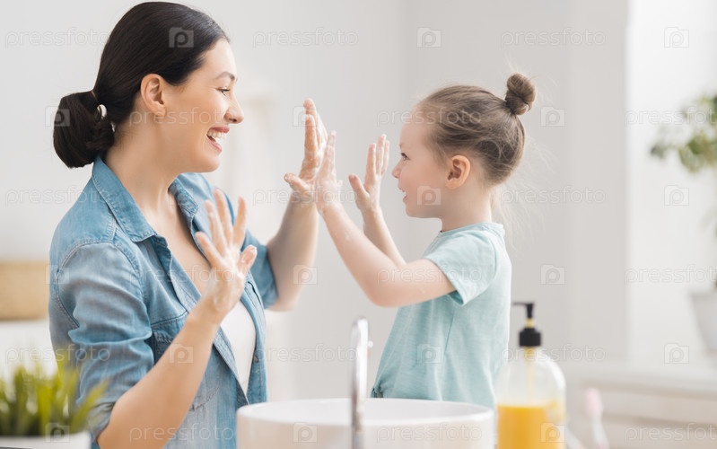 Девочка и ее мама моют руки