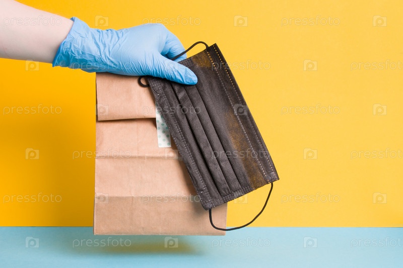 Концепция бесконтактной доставки еды, рука курьера в синей резиновой перчатке держит заказ, защитная маска для лица и бумажный пакет желтого цвета на синем фоне