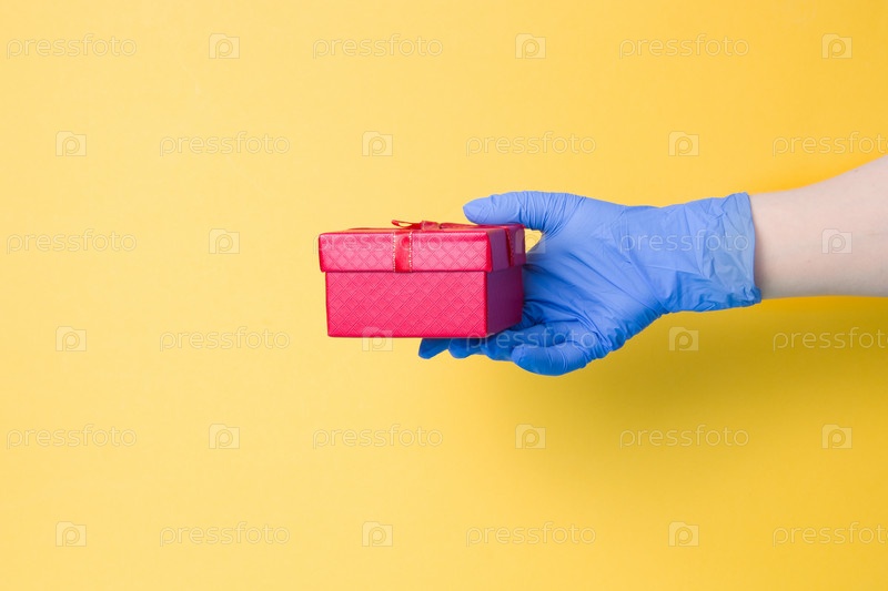 Рука в синей одноразовой перчатке держит красную подарочную коробку с бантом из красной ленты с золотой нитью, желтый фон, пространство для копирования