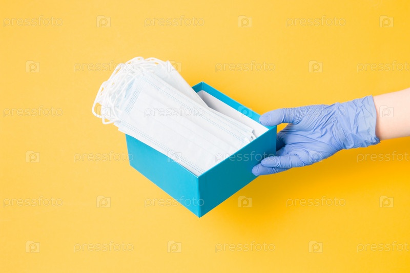 Рука в синей одноразовой перчатке держит синюю коробку с защитными медицинскими масками для лица, желтый фон, место для копирования