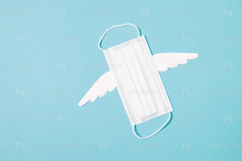 Медицинская защитная маска с крыльями из белой бумаги на голубом фоне, пространство для копирования, концепция пандемии коронавируса, отмена рейсов и путешествий, карантин 2020