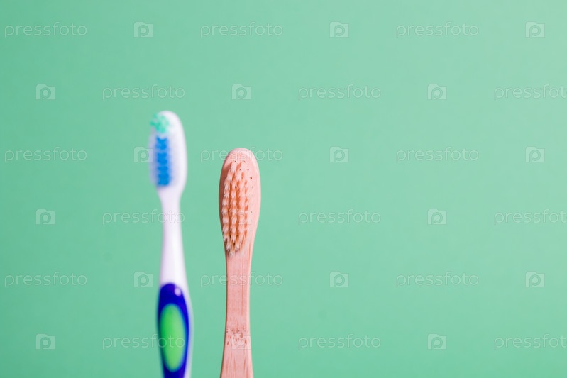 Бамбуковые и пластиковые зубные щетки на зеленом фоне, концепция экологически чистого образа жизни, пластиковое загрязнение планеты, нулевые отходы и скажем нет концепции пластика