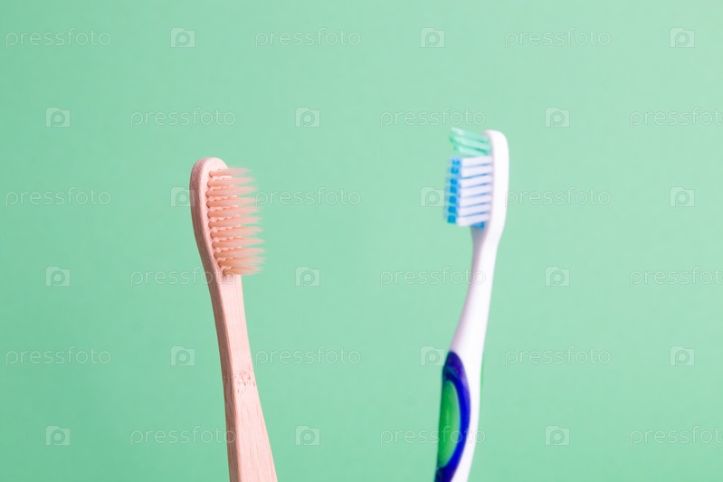 Бамбуковые и пластиковые зубные щетки на зеленом фоне, концепция экологически чистого образа жизни, пластиковое загрязнение планеты, нулевые отходы и скажем нет концепции пластика