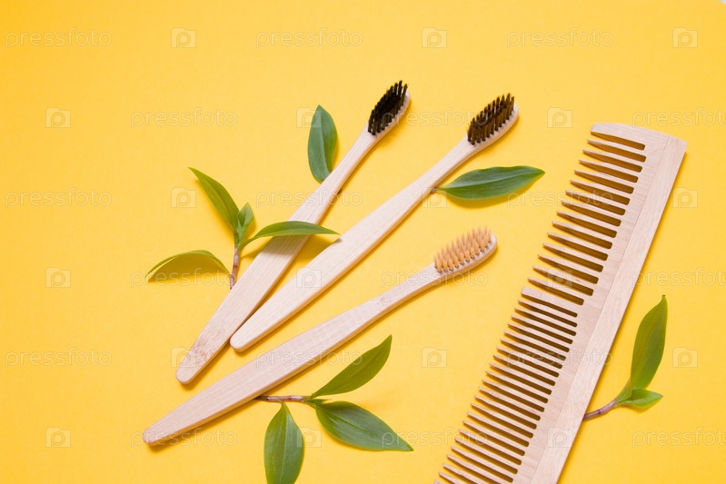 Деревянные расчески и бамбуковые зубные щетки на желтом фоне, концепция защиты окружающей среды от загрязнения, образ жизни без отходов, листья как символ натуральных материалов
