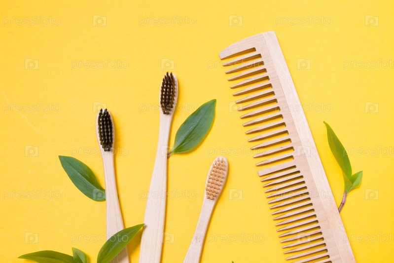 Деревянные расчески и бамбуковые зубные щетки на желтом фоне, концепция защиты окружающей среды от загрязнения, образ жизни без отходов, листья как символ натуральных материалов