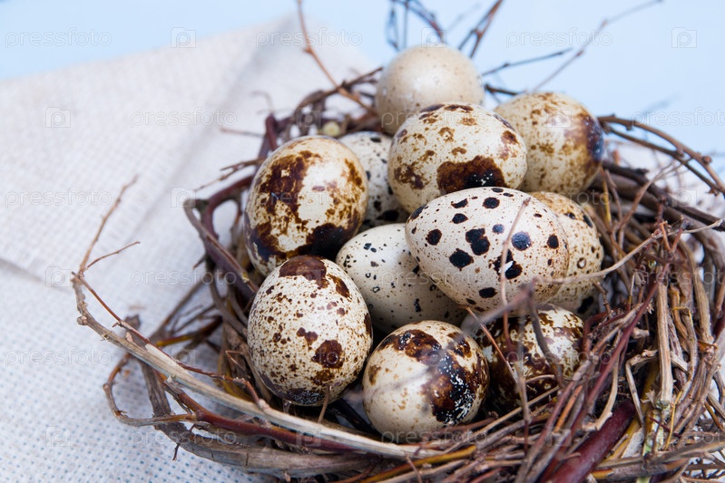 Перепелиные яйца в гнезде из веток на голубом фоне, льняная ткань, пространство для копирования. Пасхальный фон, крупный план