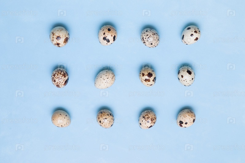 Шаблон перепелиных яиц на синем фоне. концепция правильного питания. пасхальный фон, минимализм, вид сверху