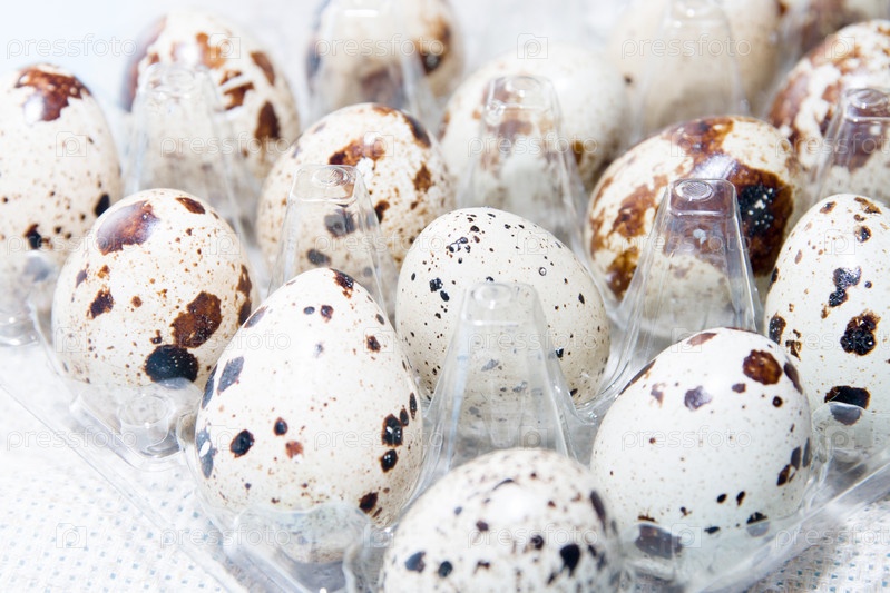 Перепелиные яйца в пластиковом прозрачном лотке для яиц на светлом фоне, льняная ткань, пространство для копирования. Пасхальный фон, крупный план