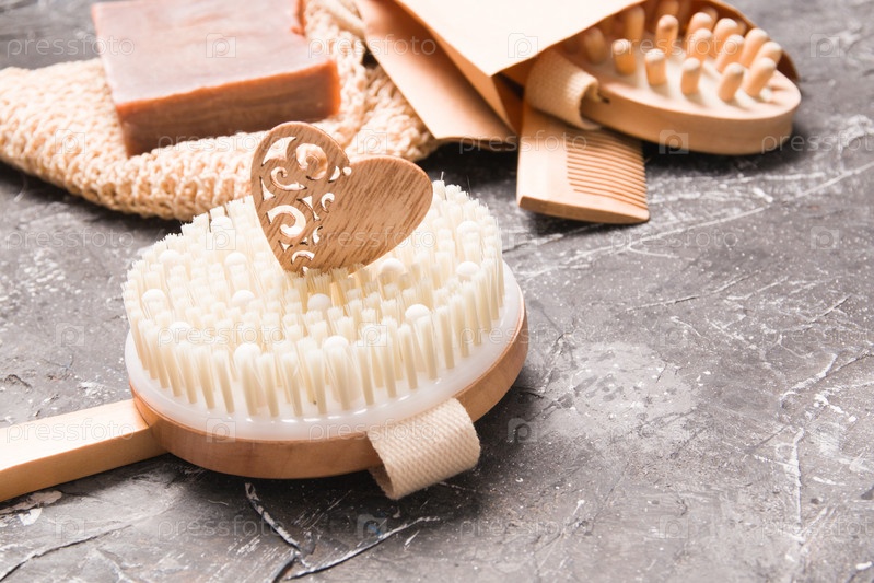 Натуральная деревянная щетка для сухого массажа против целлюлита на черном фоне, экологически чистый образ жизни, домашнее мыло, вязаная мочалка, деревянная расческа на заднем плане