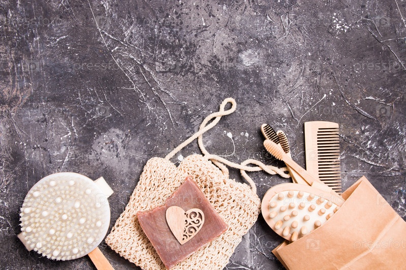 Сухая массажная щетка от целлюлита, вязаная хлопковая губка, натуральное какао-мыло и бумажный пакет с бамбуковыми зубными щетками, деревянная расческа и массажер для тела на черном фоне