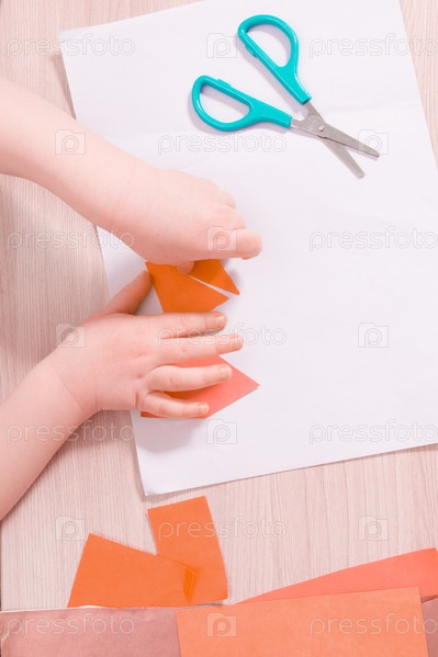 Маленький ребенок клеит бумагу, детские безопасные ножницы и цветную бумагу на столе, чем заняться с ребенком дома, детские ручки клеят цветные треугольники на лист белой бумаги